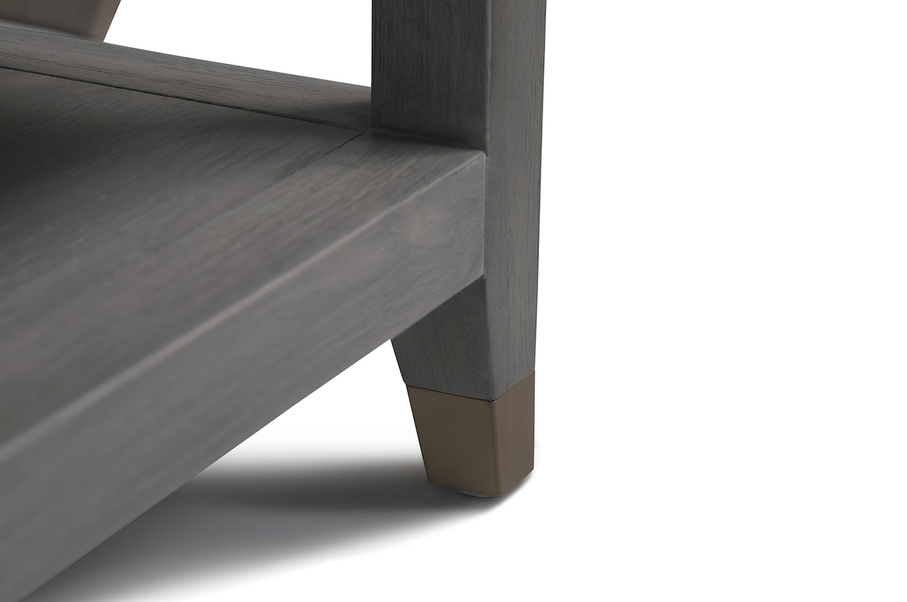 Faux Shagreen and American Oak coffee table with two soft closing drawers with Brass trim, hardware and leg caps with a lower shelf, finished in a Grey wash.